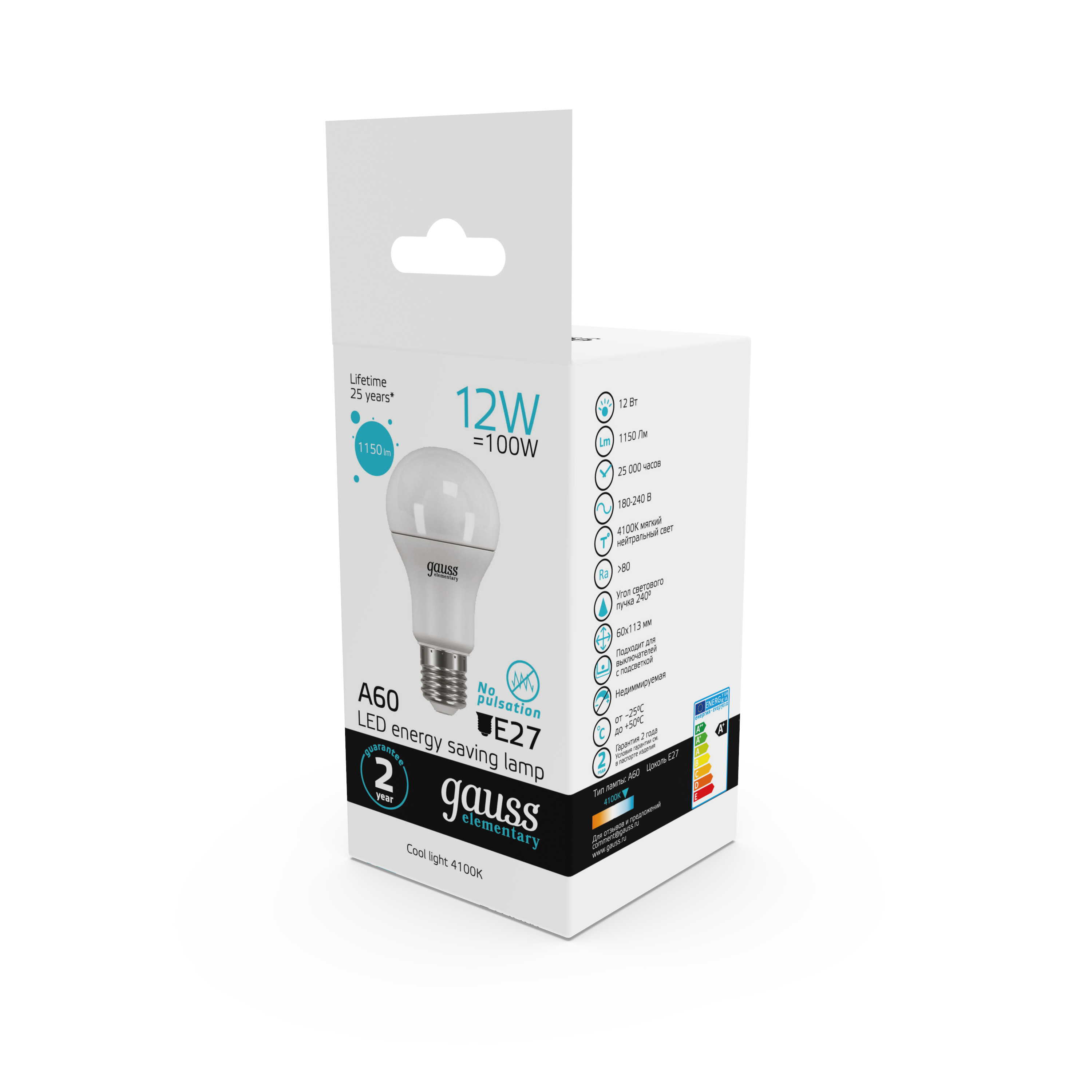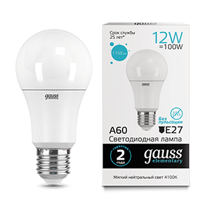 Лампа Gauss Elementary A60 наполнит комнаты мягким освещением для продуктивной деятельности.  Светлый тон температурой в 4100K создает атмосферу самого начала хорошего солнечного дня.