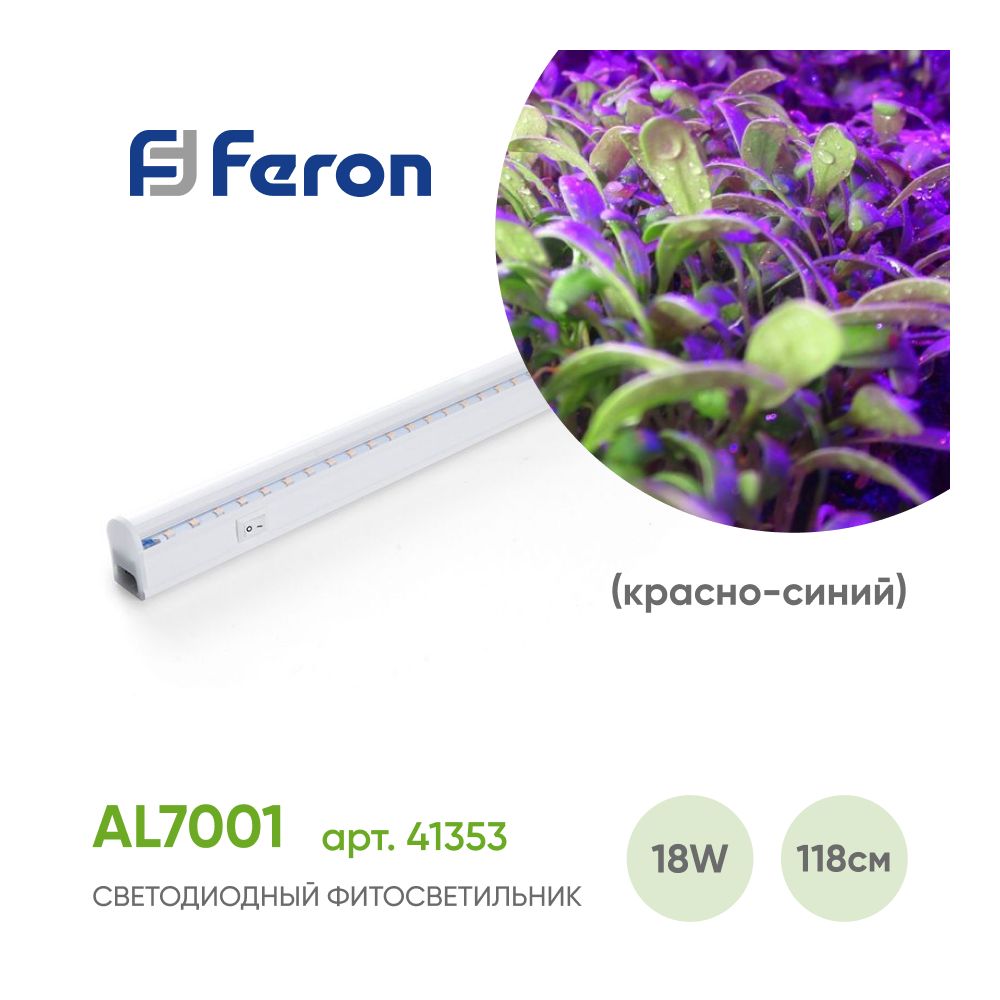 Светильник линейный светодиодный, для растений  (ДББ) FERON AL7001, 18W, спектр фотосинтез (красно-синий), 230V, 720Lm, IP40, цвет белый, корпус пластик, рассеиватель пластик, 1173*20*31 мм