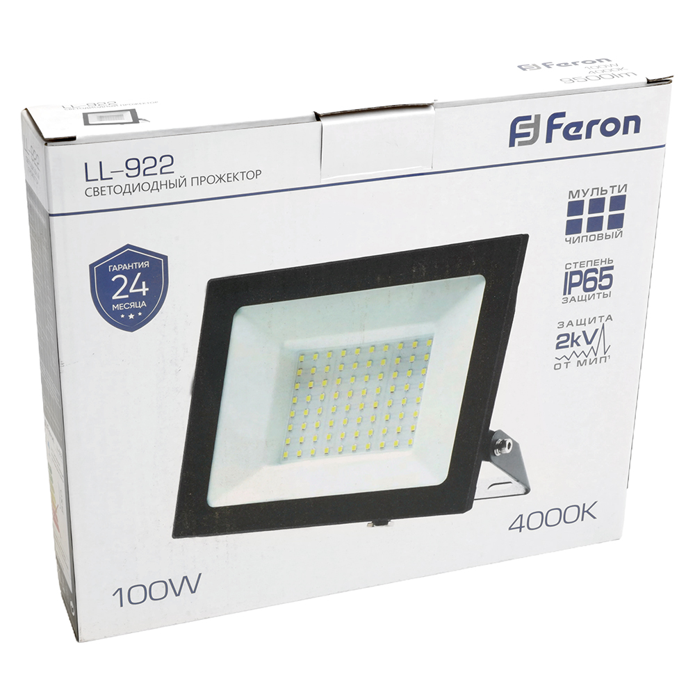 Прожектор светодиодный многоматричный с монтажным креплением на кронштейн, (ДО) FERON LL-922, 100W, 4000К (белый), 230V/50Гц, 10000Lm, IP65, угол рассеивания 120°,*SMD2835, раб.t -40°C - +40°C, цвет чёрный, корпус алюминий литой под давлением + стекло, 216*189*33 мм