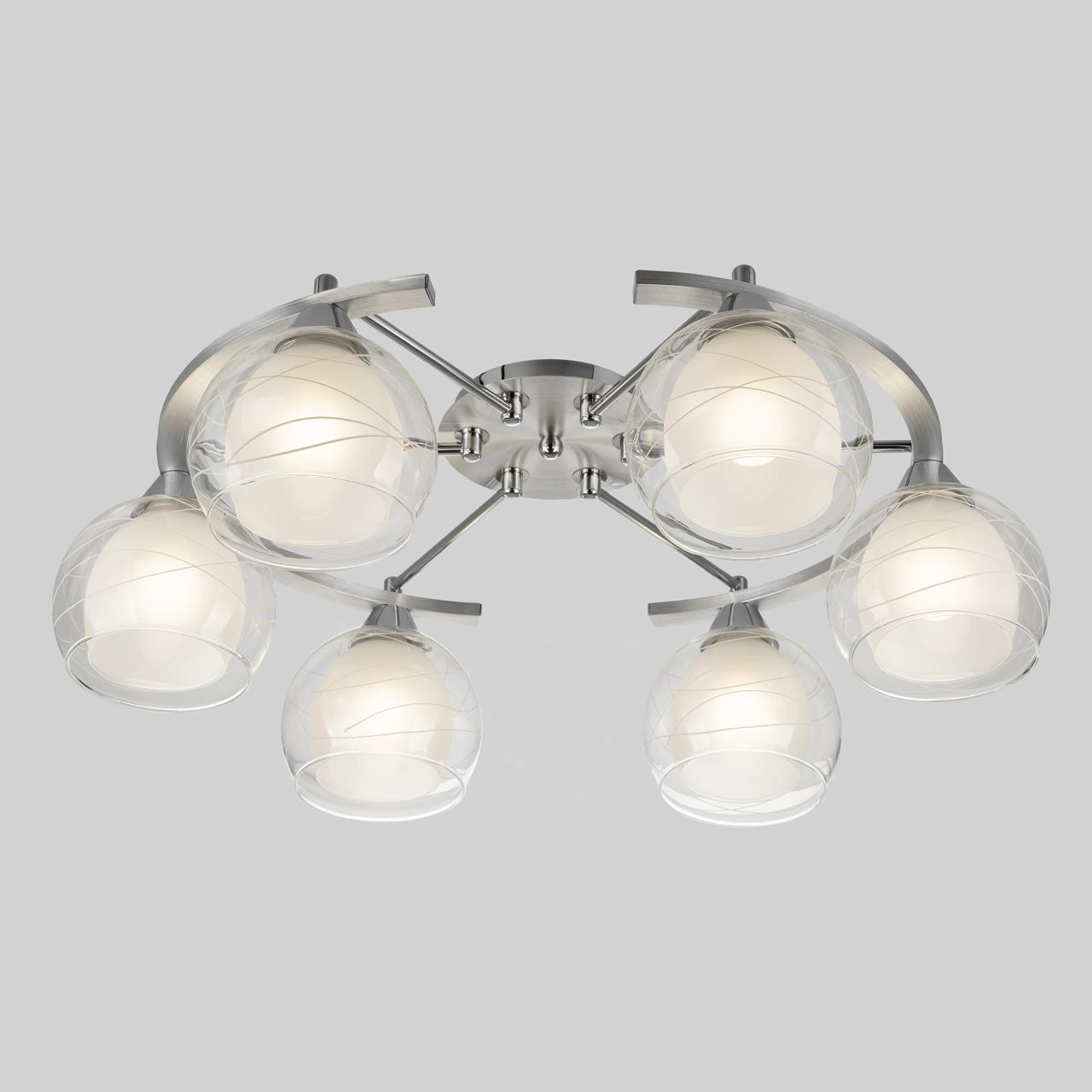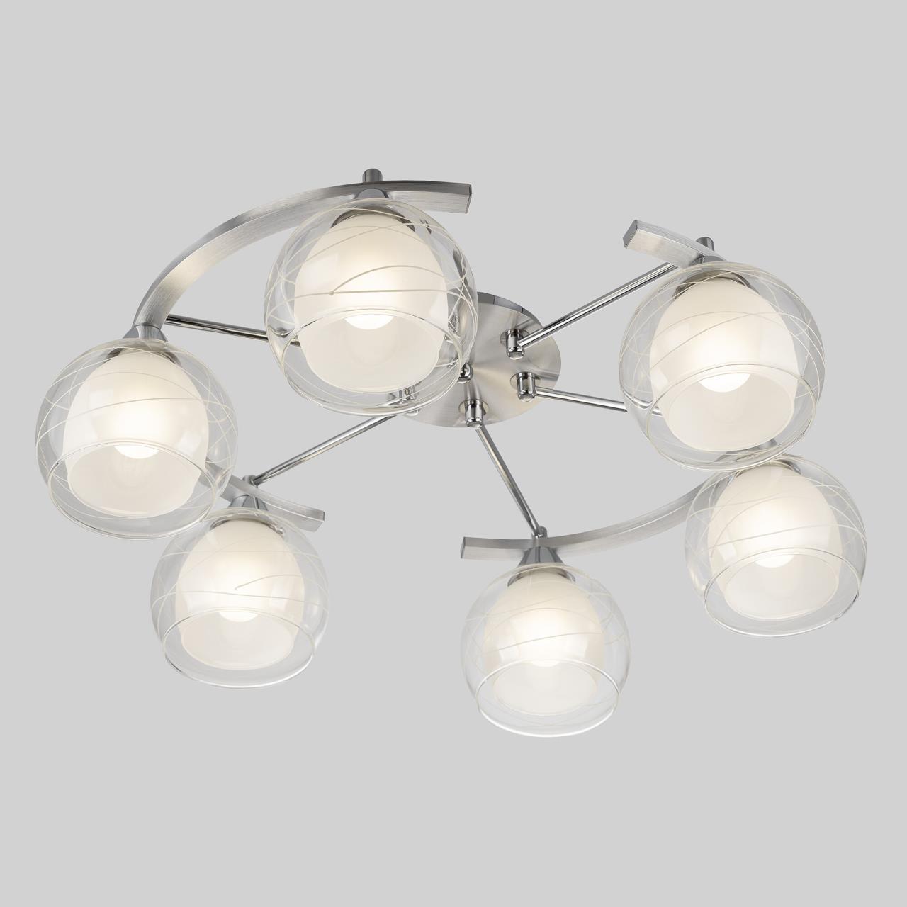 Потолочные светильники серии «Буги» выделяется интересным дизайном в стиле модерн. Люстры сделаны из легкого метала и интересными стеклянными двойными плафонами. Внешняя сторона плафона прозрачная с дизайнерским узором, а внутренняя полупрозрачная. За счёт полупрозрачного плафона свет в помещении получается очень яркий, равномерно рассеянный, но вместе с тем мягкий, приятный для зрения. Арматура модели на шесть рожков с завода в упаковке собрана и скоммутирована на двойной выключатель. Деление осуществлено 4х2, с одной клавиши будет включаться четыре плафона, со второй ещё два. Подключение произведено через один плафон. Люстры производятся в двух цветах: белый плюс хром, идеальное решение для нежных и светлых интерьеров, и алюминий плюс хром, который лучше сочетается с современными дизайнами. Арматура слегка вытянута, не идеальный круг. Такое конструктивное решение позволяет достигать хороших показателей освещённости по углам комнаты. Крепятся люстры под потолком тем самым они не занимают место и прекрасно подходят к помещениям с небольшой высотой потолка. Патроны выполнены из термостойких материалов, выдерживают лампы накаливания до 75 ватт включительно, а энергосберегающие, или светодиодные лампы можно использовать любой яркости, что позволит вам осветить большие площади. Площадь освещения моделей на четыре рожка до 21 квадратного метра.