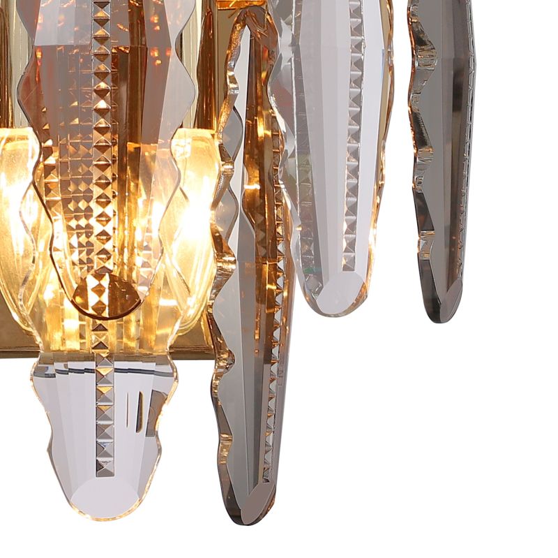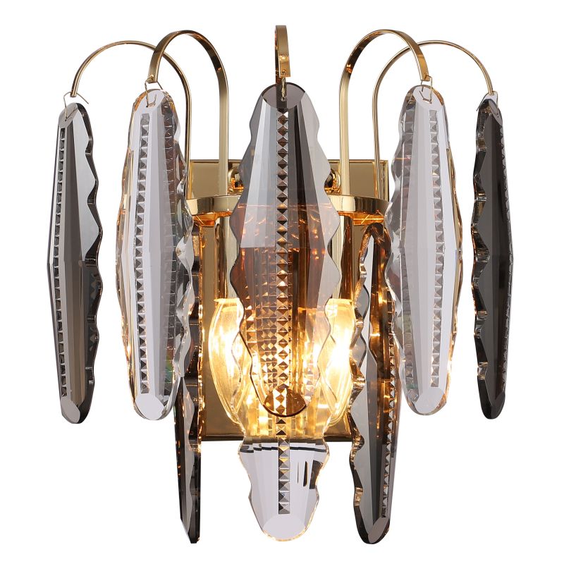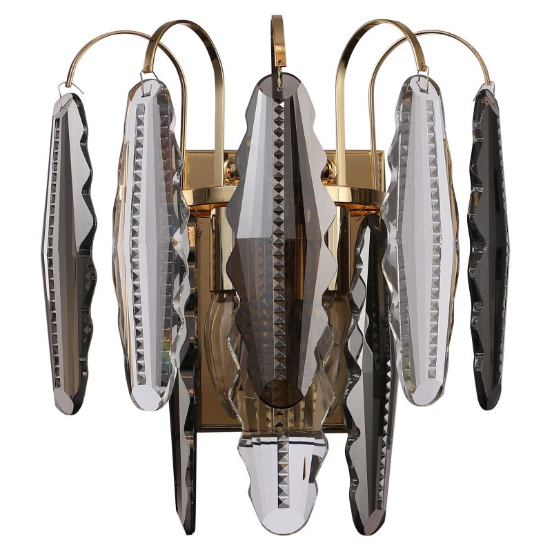 Светильник настенный из коллекции Florin / Флорин выполнен из металла, гальванизированного в цвет золота, и декорирован прозрачным и дымчатым хрусталем вытянутой формы высшей категории.