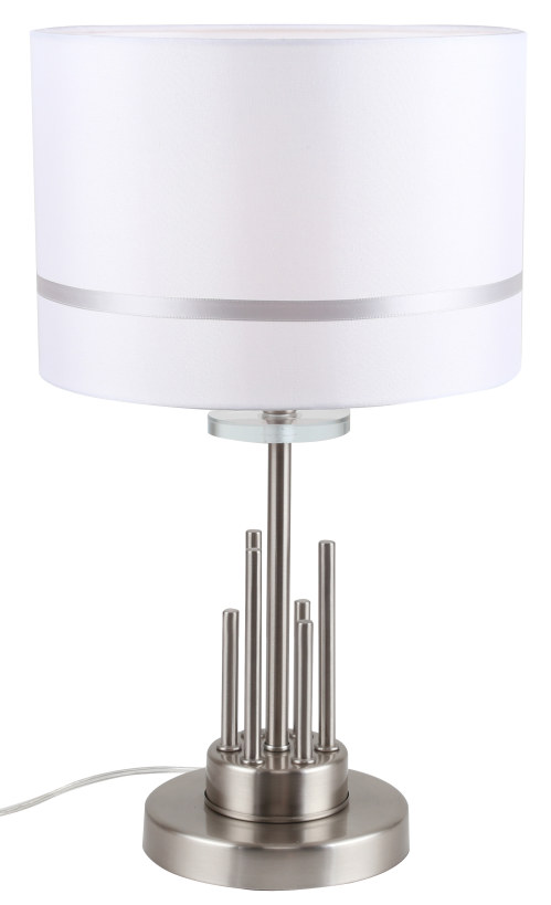 Светильник настольный из коллекции Chart / Чарт выполнен из металла, гальванизированного в цвет никеля, и декорирована железными стержнями в цвет арматуры. Текстильный абажур белого цвета с термостойким акрилом внутри отделан кантом в цвет арматуры. Декоративная розетка выполнена из прозрачного стекла.